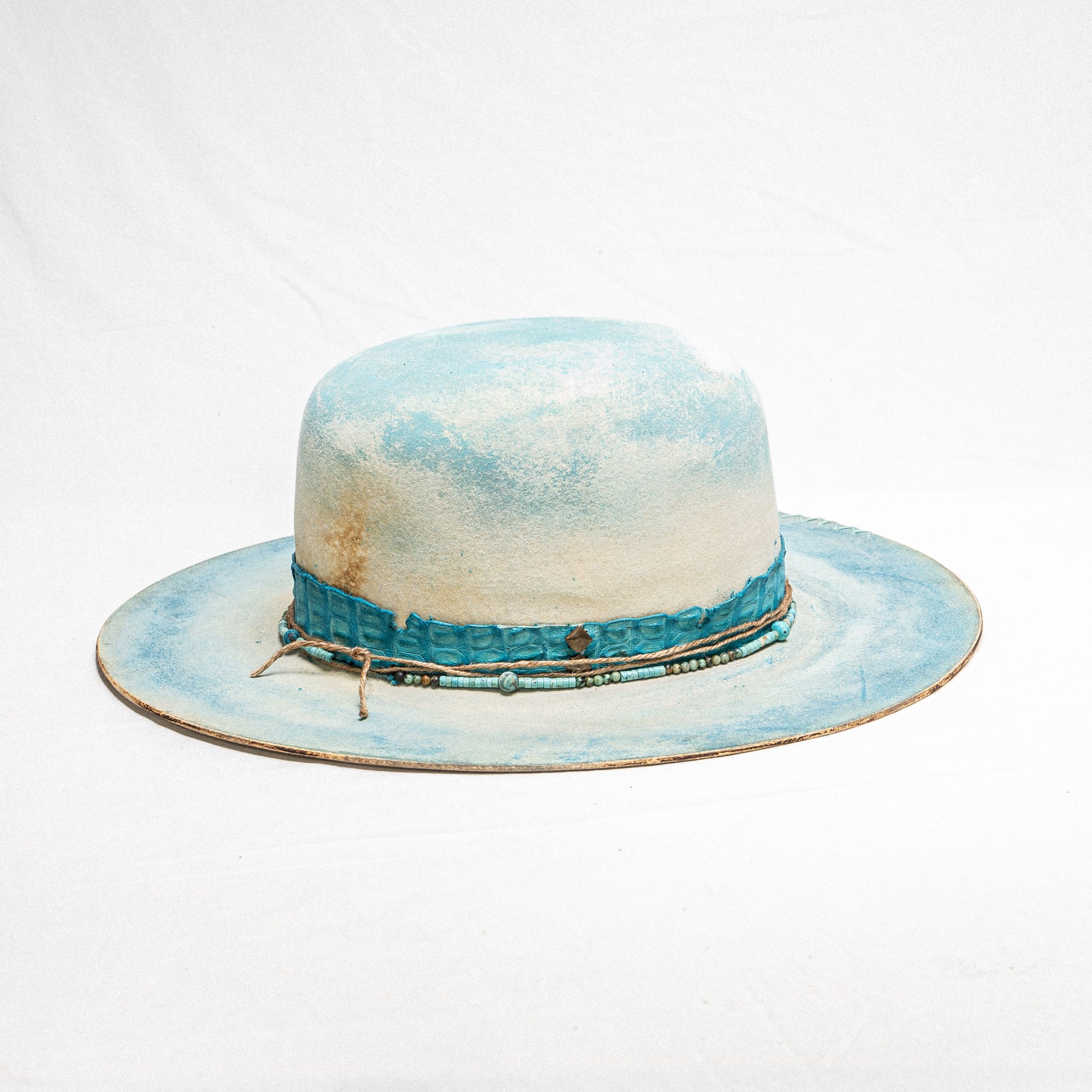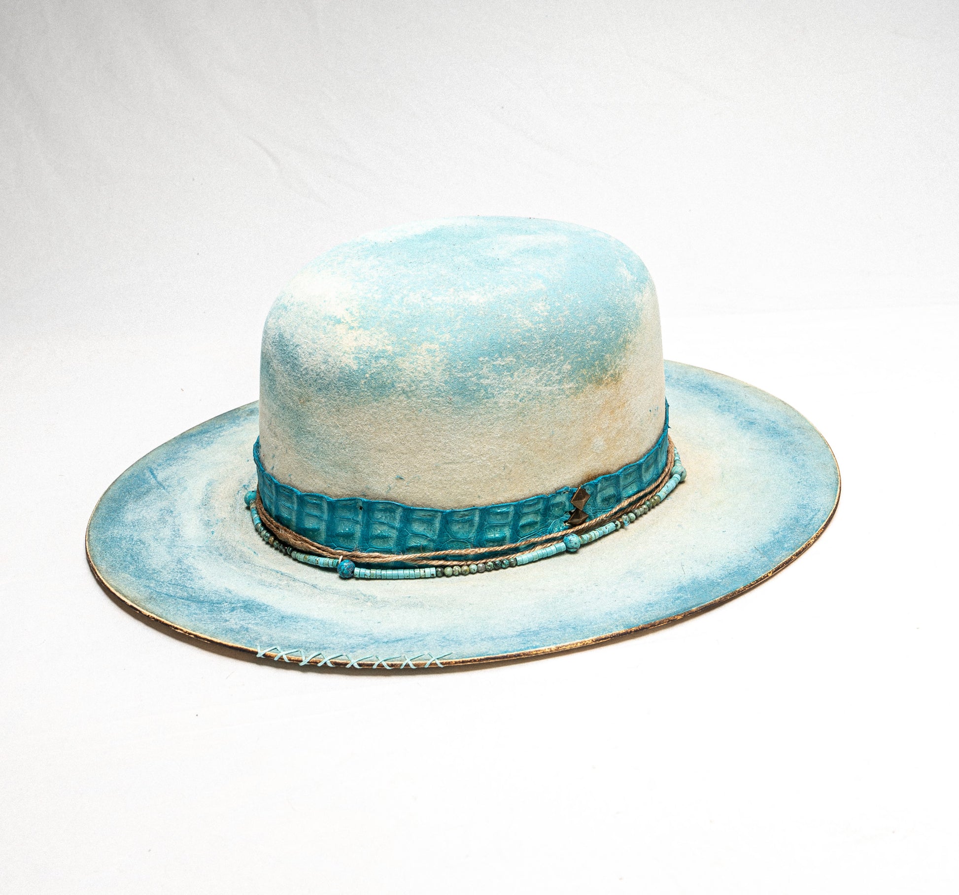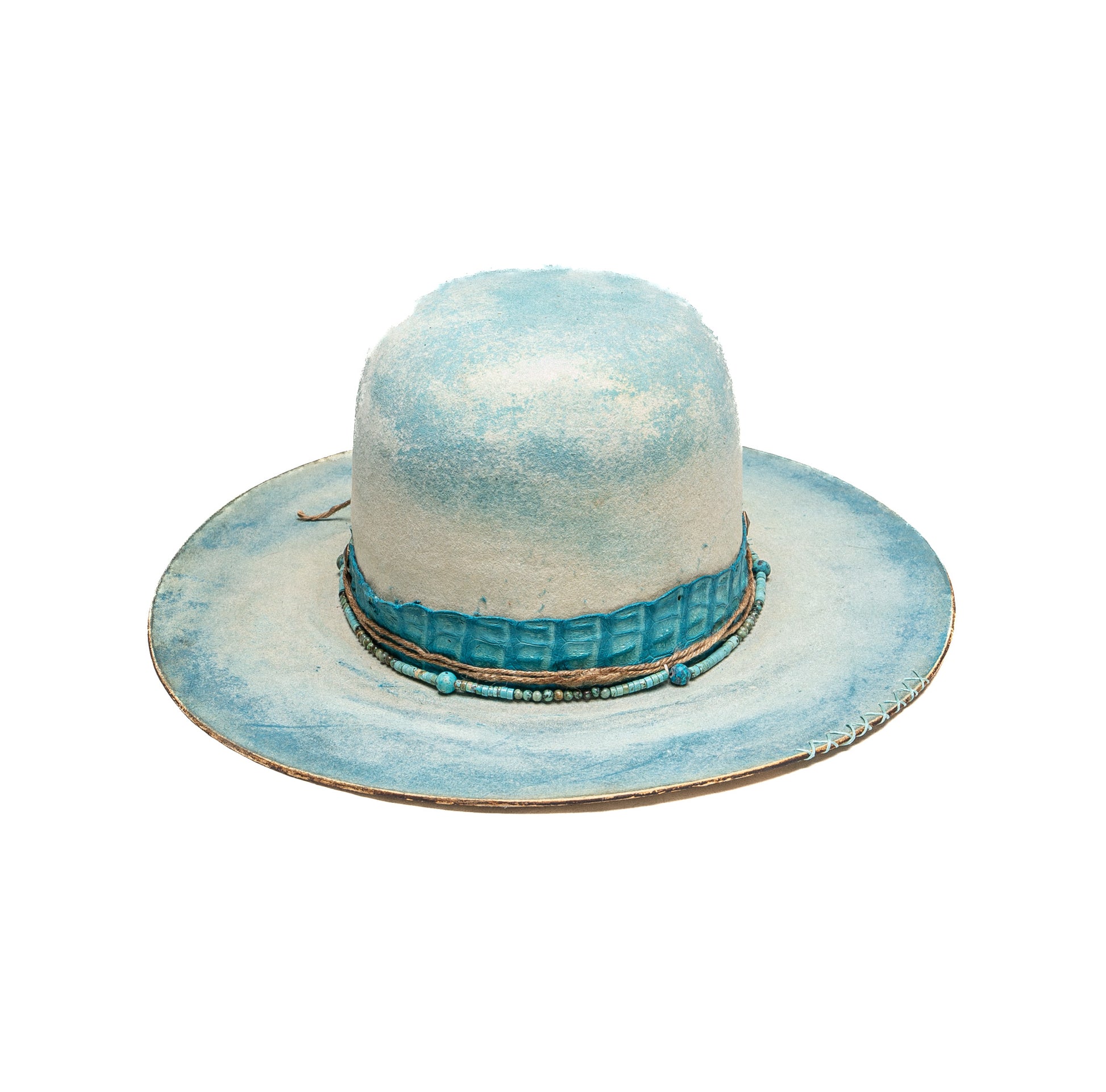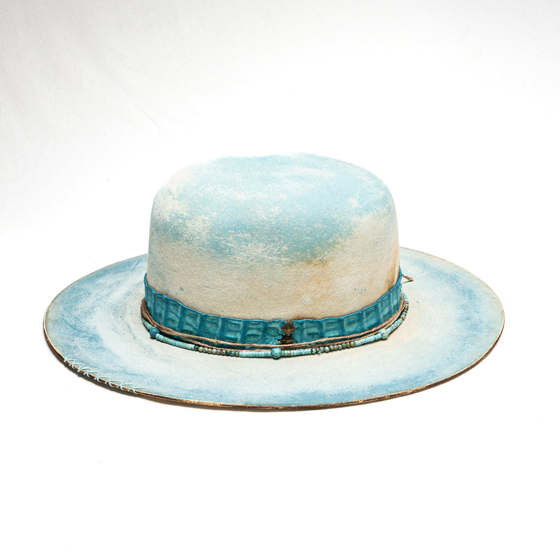 An ocean-inspired statement with coastal soul. Boca features a turquoise gator band, handcrafted turquoise beads, and light blue distressed detailing for a fresh, beach-driven look. A custom die finish adds the perfect artistic touch.
