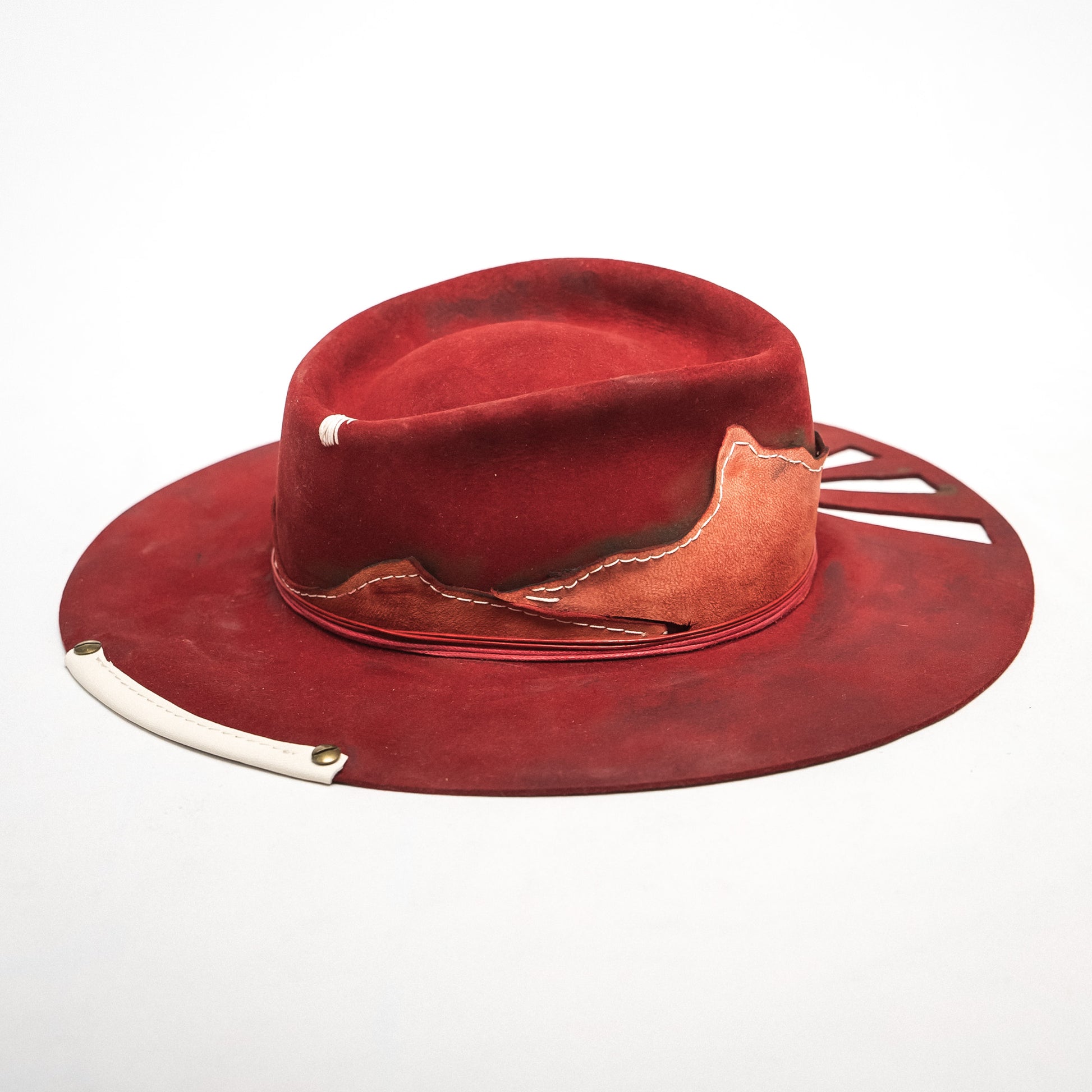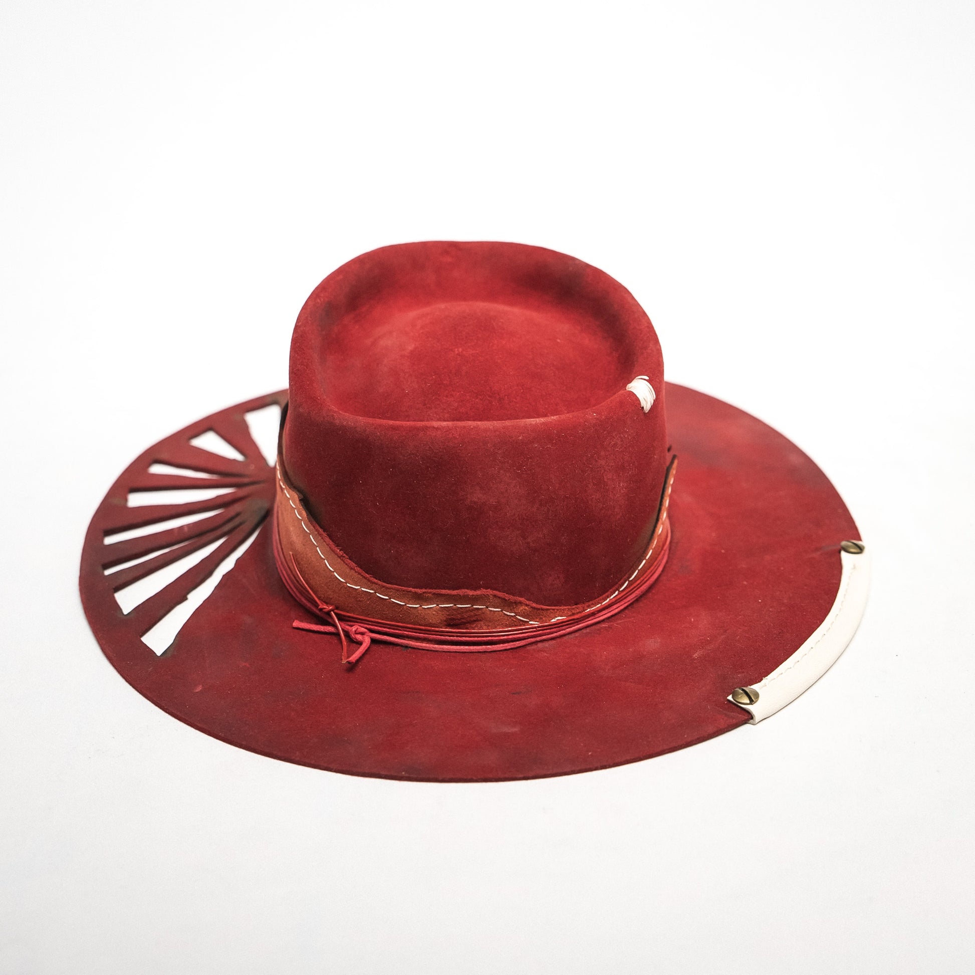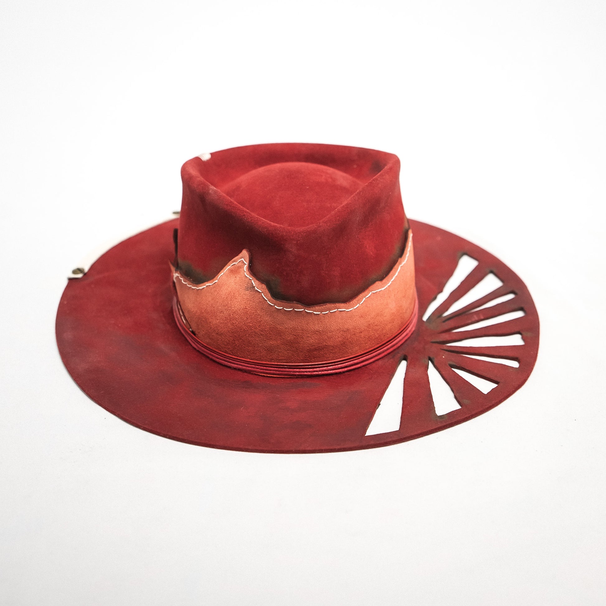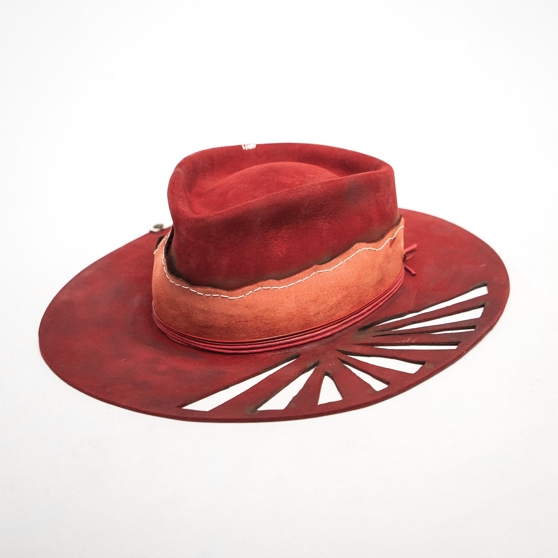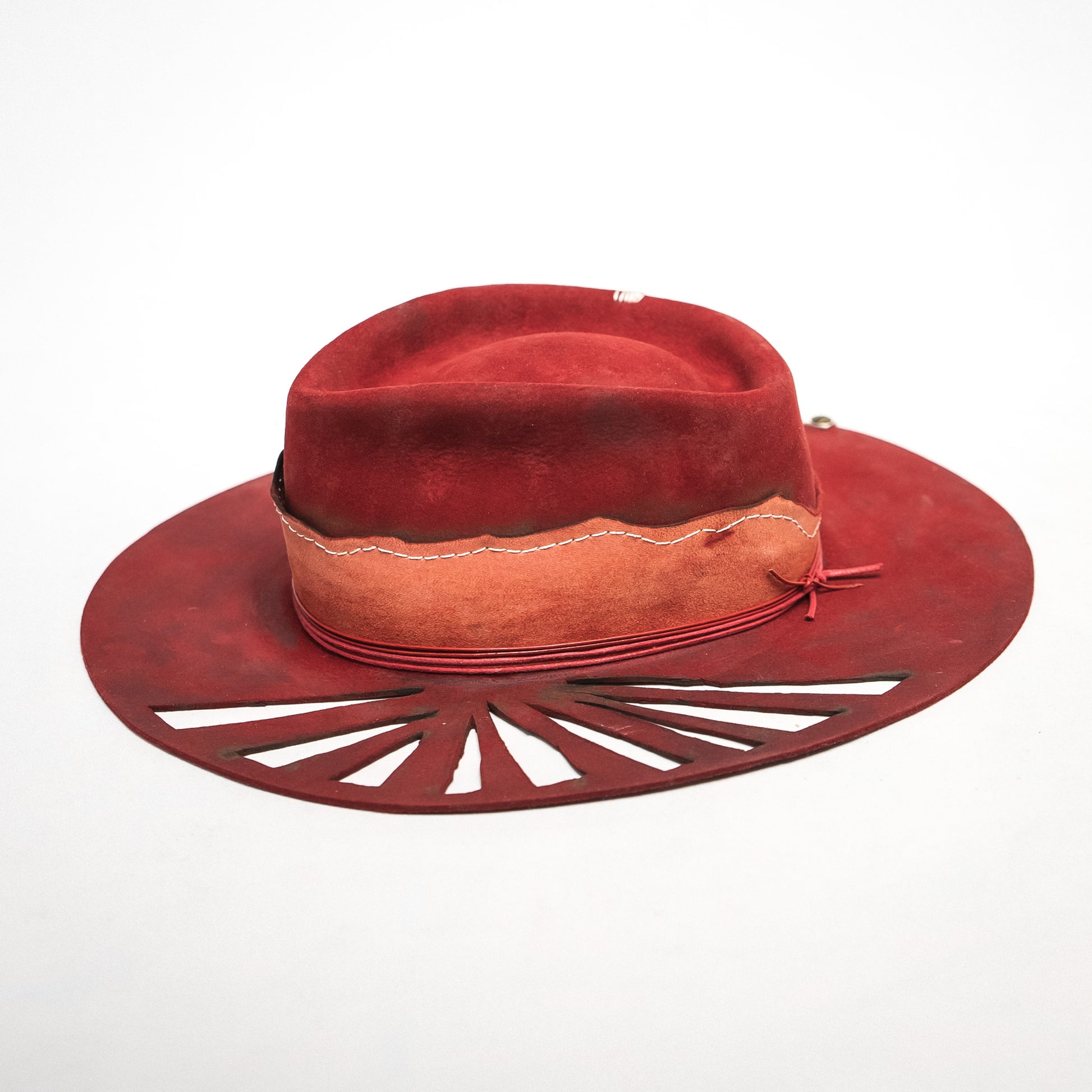 A striking blend of bold color and meticulous craftsmanship, this red hat features a rustic red band adorned with an engraved sun and finely detailed accents. Every element is thoughtfully designed, making it a wearable statement piecethat stands out in any outfit or can be displayed as art.